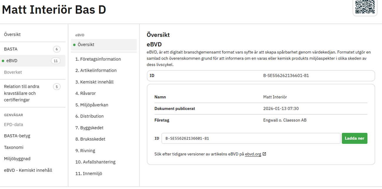 Under kriterieområdet finns produktens innehållslista, vilken är hämtad från eBVD. Där kan man snabbt och enkelt kan se vilka ämnen som ingår i produkten och se vilket/vilka ämnen som kopplar till produktens BASTA-betyg och anledningen till produktens betyg.