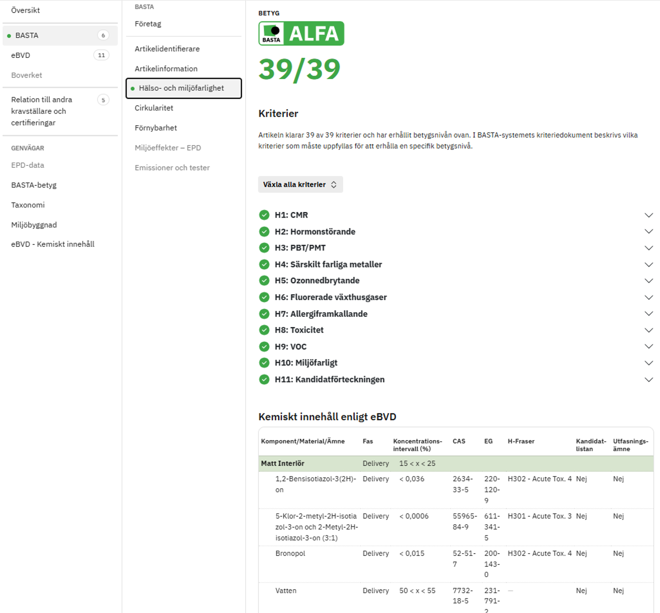 Under kriterieområdet finns produktens innehållslista, vilken är hämtad från eBVD. Där kan man snabbt och enkelt kan se vilka ämnen som ingår i produkten och se vilket/vilka ämnen som kopplar till produktens BASTA-betyg och anledningen till produktens betyg.