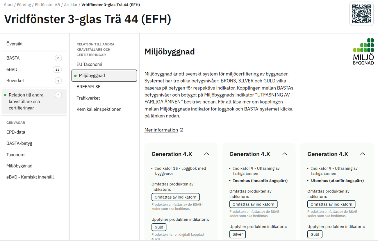BASTA visar om artikeln uppfyller olika certifieringar bland annat genom kopplingen till eBVD-systemet, läs mer på Certifieringar.